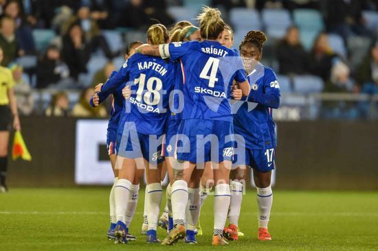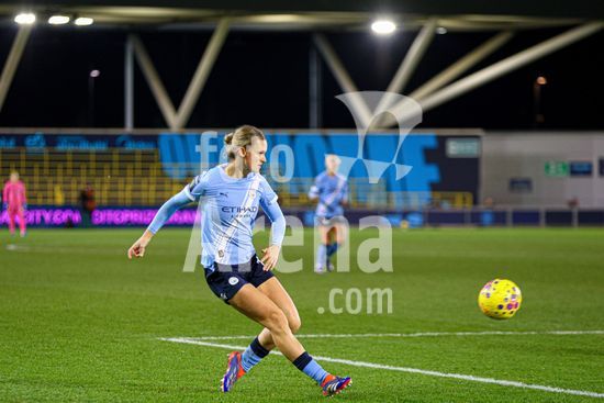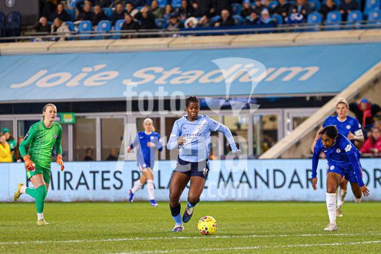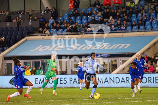 2871527 Khadija Bunny Shaw (9 Manchester City) com a bola durante a partida semifinal da Copa da Liga Feminina Subway entre Manchester City e Chelsea no Estadio Joie em Manchester, Inglaterra. (Natalie Mincher/SPP)