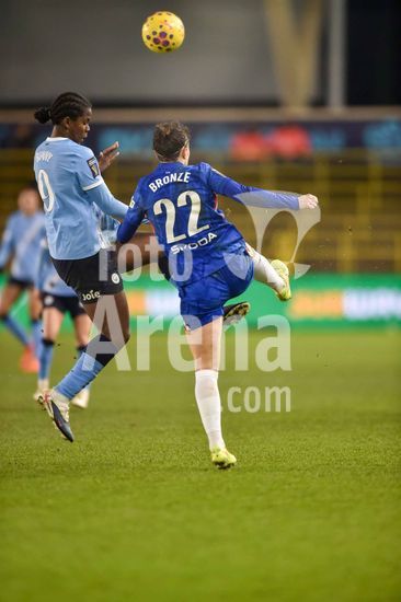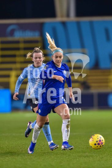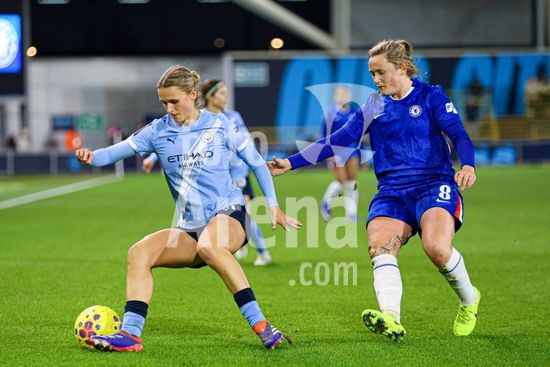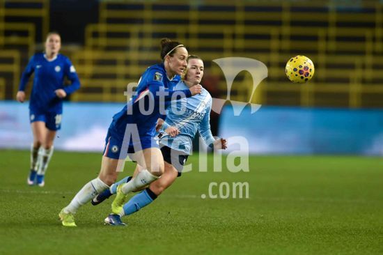 2871240 Kerstin Casparij (18 Manchester City) e Sandy Baltimore (17 Chelsea) disputam a bola durante a partida semifinal da Copa da Liga Feminina Subway entre Manchester City e Chelsea no Estadio Joie em Manchester, Inglaterra. (Natalie Mincher/SPP)