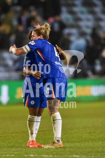 2871630 Johanna Rytting Kaneryd (19 Chelsea) ri com a companheira de equipe, a goleira Becky Spencer (38 Chelsea), durante a partida semifinal da Copa da Liga Feminina Subway entre Manchester City e Chelsea, no Estadio Joie, em Manchester, Inglaterra. (Natalie Mincher/SPP)