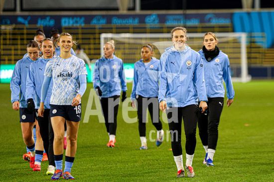 2871634 Jogadoras do Manchester City se aquecem durante a partida semifinal da Copa da Liga Feminina do Subway entre Manchester City e Chelsea no Estadio Joie em Manchester, Inglaterra. (Natalie Mincher/SPP)