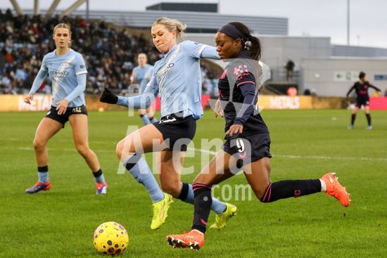 2867413 Laura Blindkilde Brown (19 Manchester City Women) controla a bola durante a partida da Barclays Women's Super League entre Manchester City e Everton no Joie Stadium em Manchester, Inglaterra, em 11 de janeiro de 2026. (Sean Chandler / SPP)