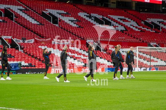 2912051 MANCHESTER, INGLATERRA - 25 de marco: Jogadoras do Bayern de Munique se aquecem durante a partida da Liga dos Campeoes Feminina da UEFA entre Manchester United e Bayern de Munique no Old Trafford, em Manchester, Inglaterra. (Natalie Mincher/SPP)