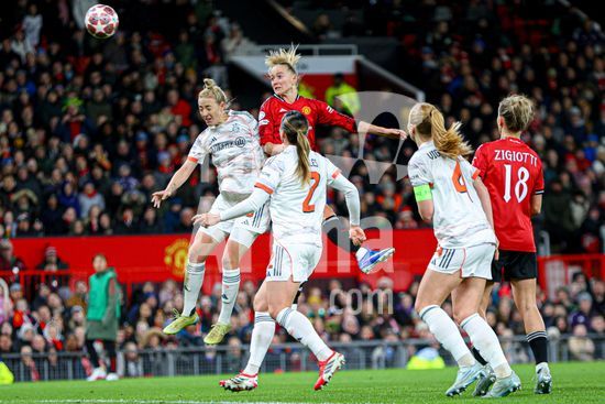 2911724 MANCHESTER, INGLATERRA - 25 de marco: Lea Schuller, do Manchester United, cabeceia a bola durante a partida da Liga dos Campeoes Feminina da UEFA entre Manchester United e Bayern de Munique, no Old Trafford, em Manchester, Inglaterra. (Natalie Mincher/SPP)