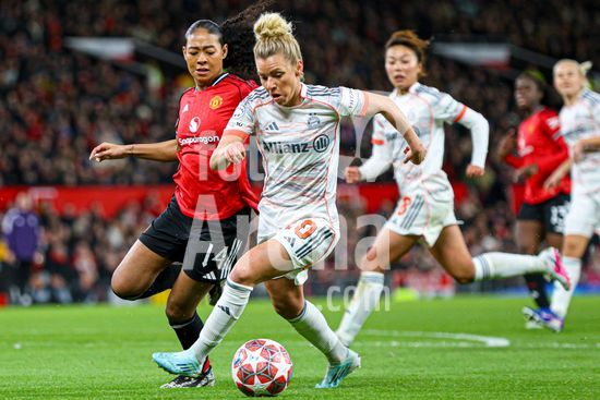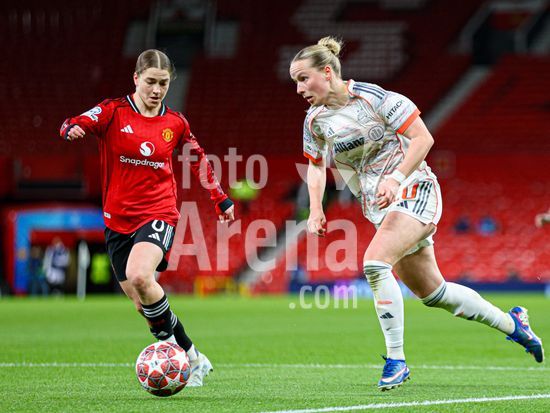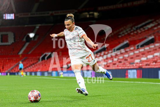 2912056 MANCHESTER, INGLATERRA - 25 de marco: Franziska Kett, do Bayern de Munique, com a bola durante a partida da Liga dos Campeoes Feminina da UEFA entre Manchester United e Bayern de Munique, no Old Trafford, em Manchester, Inglaterra. (Natalie Mincher/SPP)