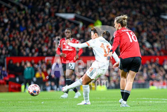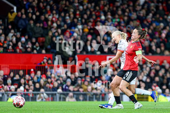 2912005 MANCHESTER, INGLATERRA - 25 de marco: Pernille Harder, do Bayern de Munique, marca o segundo gol do Bayern durante a partida da Liga dos Campeoes Feminina da UEFA entre Manchester United e Bayern de Munique, no Old Trafford, em Manchester, Inglaterra. (Natalie Mincher/SPP)