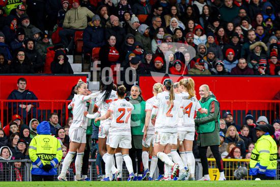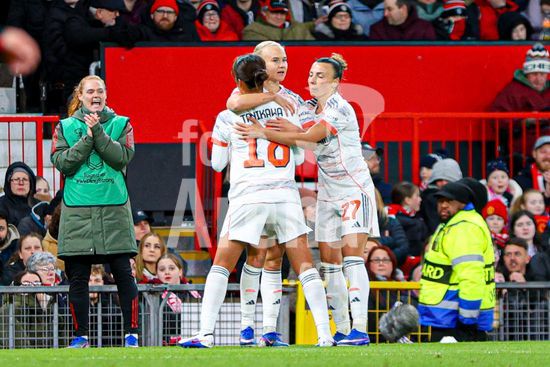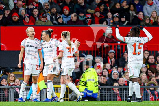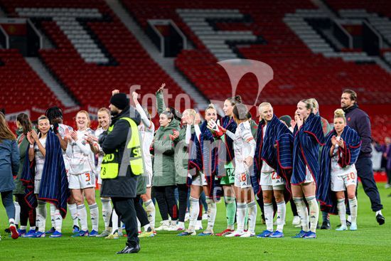2912040 MANCHESTER, INGLATERRA - 25 de marco: Jogadoras do Bayern de Munique comemoram o apito final da partida da Liga dos Campeoes Feminina da UEFA entre Manchester United e Bayern de Munique, no Old Trafford, em Manchester, Inglaterra. (Natalie Mincher/SPP)
