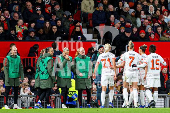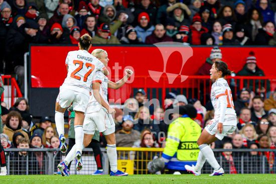 2912006 MANCHESTER, INGLATERRA - 25 de marco: Pernille Harder, do Bayern de Munique, comemora o segundo gol do Bayern durante a partida da Liga dos Campeoes Feminina da UEFA entre Manchester United e Bayern de Munique, no Old Trafford, em Manchester, Inglaterra. (Natalie Mincher/SPP)