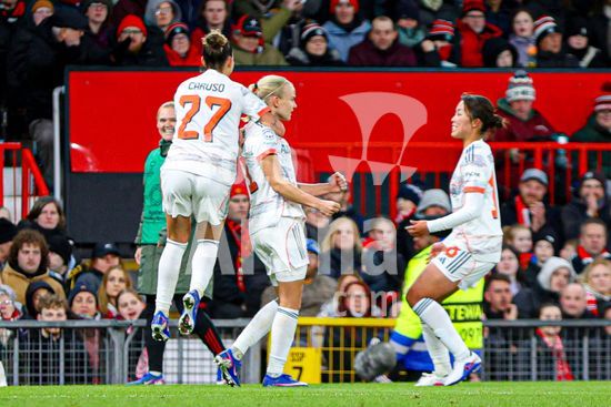 2912024 MANCHESTER, INGLATERRA - 25 de marco: Pernille Harder, do Bayern de Munique, comemora o segundo gol do Bayern durante a partida da Liga dos Campeoes Feminina da UEFA entre Manchester United e Bayern de Munique, no Old Trafford, em Manchester, Inglaterra. (Natalie Mincher/SPP)