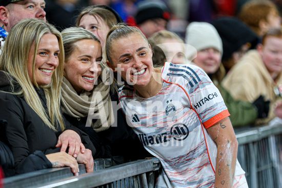 2912039 MANCHESTER, INGLATERRA - 25 de marco: Jogadoras do Bayern de Munique comemoram o apito final da partida da Liga dos Campeoes Feminina da UEFA entre Manchester United e Bayern de Munique, no Old Trafford, em Manchester, Inglaterra. (Natalie Mincher/SPP)