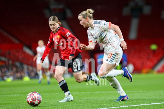 2912003 MANCHESTER, INGLATERRA - 25 de marco: Franziska Kett, do Bayern de Munique, com a bola durante a partida da Liga dos Campeoes Feminina da UEFA entre Manchester United e Bayern de Munique, no Old Trafford, em Manchester, Inglaterra. (Natalie Mincher/SPP)