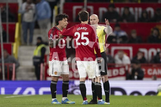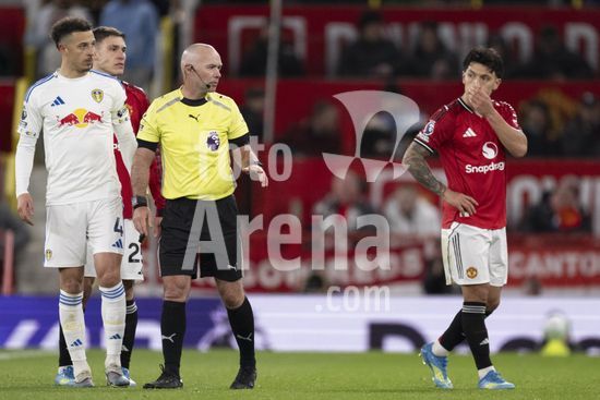 2924215 MANCHESTER, INGLATERRA - 13 DE ABRIL: O arbitro Paul Tierney expulsa Lisandro Martinez, do Manchester United, durante uma partida da Premier League 2025/26 entre Manchester United e Leeds United no Old Trafford, em Manchester, em 13 de abril de 2026. (Will Palmer/SPP)