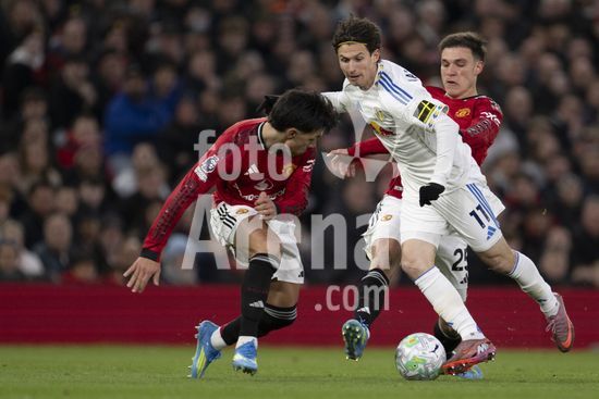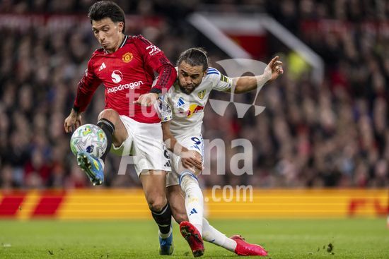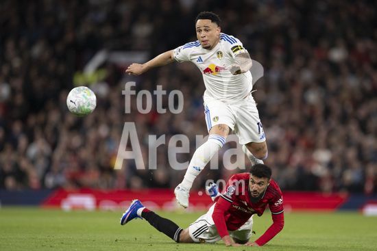 2924223 MANCHESTER, INGLATERRA - 13 DE ABRIL: Lisandro Martinez, do Manchester United (E), e Brenden Aaronson, do Leeds United (D), disputam a posse de bola durante uma partida da Premier League 2025/26 entre Manchester United e Leeds United no Old Trafford, em Manchester, em 13 de abril de 2026. (Will Palmer/SPP)