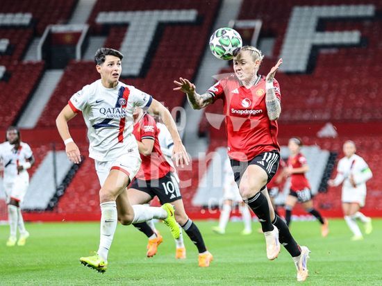 2842150 Manchester, Inglaterra, 12 de novembro de 2025: Leah Galton (11 Manchester United) olha para cima, antecipando a bola, durante a partida da Liga dos Campeoes Feminina da UEFA entre Manchester United e Paris Saint-Germain no Old Trafford em Manchester, Inglaterra (Natalie Mincher/SPP) (Natalie Mincher/SPP)