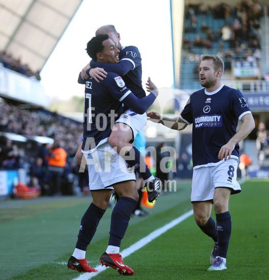 2904317 LONDRES, INGLATERRA, 14 DE MARCO: GOL 1-0, comemoracao de Femi Azeez, do Millwall, com Barry Bannan, tambem do Millwall, apos Luke Cundle marcar o gol que colocou o Millwall em vantagem por 1-0 durante a partida entre Millwall FC e Blackburn Rovers FC, valida pelo Sky Bet Championship, no Estadio The New Den, em Londres, Inglaterra, em 14 de marco. (Foto de Daniel Weir) (Daniel Weir/Sports Press Photo / SPP)