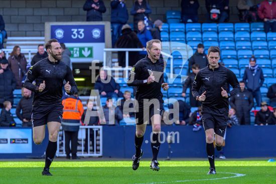2872858 O arbitro Gavin Ward, o arbitro assistente Hugh Gilroy e o arbitro assistente David Harrison durante o aquecimento antes do jogo do Sky Bet Championship entre Millwall FC e Charlton Athletic no The Den em Londres, Inglaterra. (Keeran Marquis/SPP)