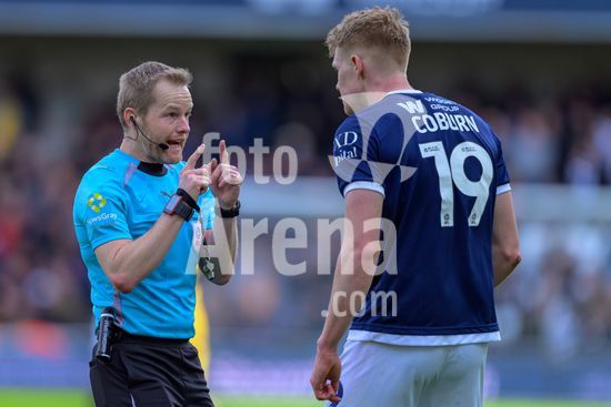 2872975 O arbitro Gavin Ward conversando com Josh Coburn (19 Millwall) durante a partida do Sky Bet Championship entre Millwall FC e Charlton Athletic no The Den, em Londres, Inglaterra. (Keeran Marquis/SPP)