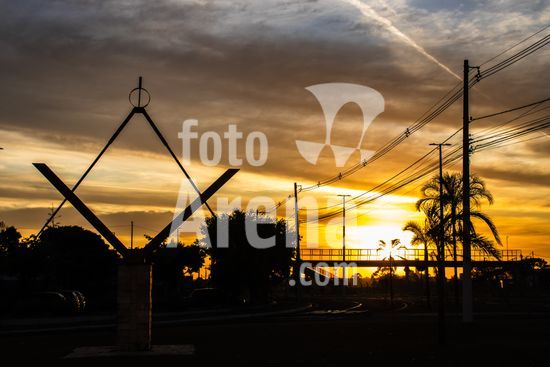 Monumento do Esquadro e o Compasso, o mais conhecido símbolo da Maçonaria, fotografado em silhueta contra o céu dramático e alaranjado do nascer do sol na cidade de Marília, SP. A imagem destaca o contraste entre o simbolismo histórico e filosófico da fraternidade, que representa a retidão, a moral e o equilíbrio, e o cenário urbano moderno, com postes, fios elétricos e rastros de aviões no céu. Esta foto é ideal para ilustrar sobre a história da Maçonaria no Brasil, sua simbologia, filosofia, ou para discutir temas como sociedades fraternais, história e a presença de marcos simbólicos no espaço público.