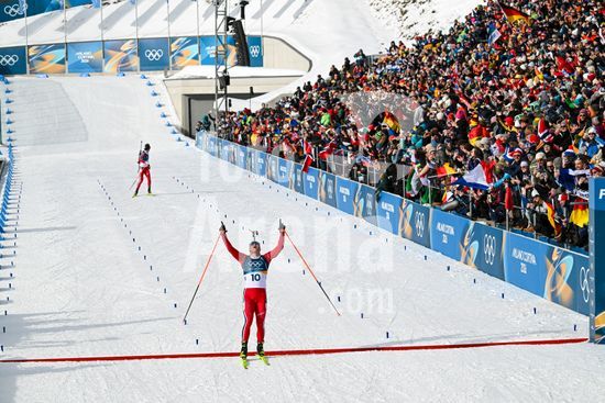 ny200226133313 Johannes Dale-Skjevdal of Norway crosses the line to win the menÕs biathlon 15-km mass start at the Anterselva Biathlon Arena in Antholz-Anterselva, Italy, on Friday, Feb. 20, 2026. (James Hill/The New York Times/Fotoarena)
