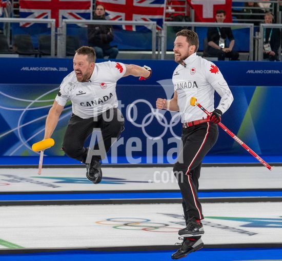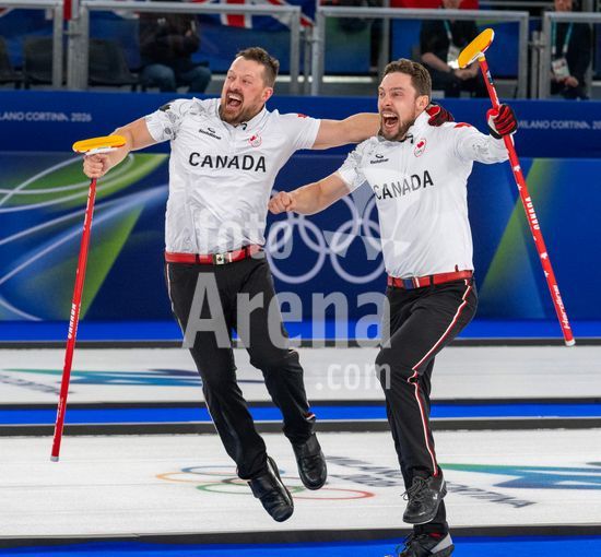 ny210226200211 Brad Jacobs, left, and Marc Kennedy, of Canada, jump onto the board of the curling ring to celebrate their victory over Great Britain during the gold medal match in men's curling at the 2026 Milan Cortina Winter Olympics in Cortina d?Ampezzo, Italy, Feb. 21, 2026. (James Hill/The New York Times/Fotoarena)