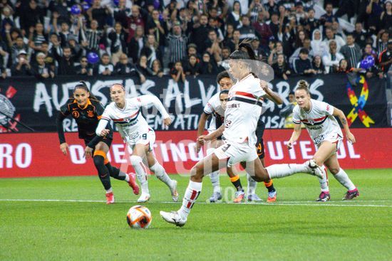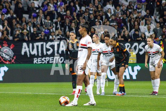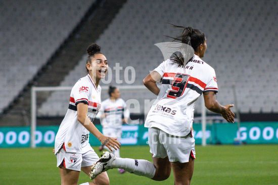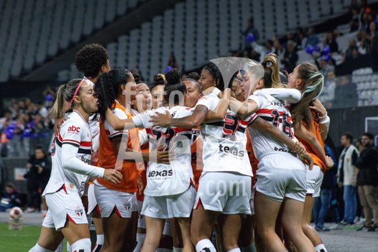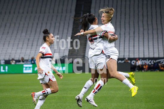 2853579 São Paulo comemorando o gol após abrir 1 a 0 durante a partida Corinthians X São Paulo, semifinal do Paulistão Feminino, realizada no Neo Química Arena em São Paulo, SP.
