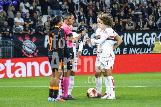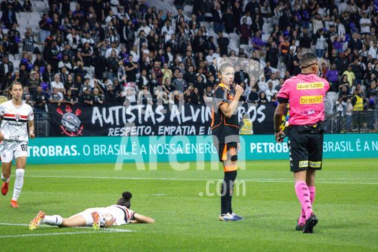 2853593 Arbitro marca penalti para o São Paulo durante a partida Corinthians X São Paulo, semifinal do Paulistão Feminino, realizada no Neo Química Arena em São Paulo, SP.