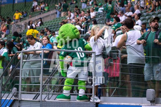 2909923 Mascote do Palmeiras interage com a torcida antes da partida entre Palmeiras X Vitória-BA, válida pela quarta rodada do Campeonato Brasileiro Feminino Série A1 2026, nessa manhã (11h) de domingo (22), no Allianz Parque, SP.