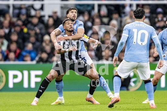 2846875 NEWCASTLE UPON TYNE, INGLATERRA - 22 DE NOVEMBRO: Ruben Dias, do Manchester City, e Joelinton, do Newcastle United, disputam a posse de bola durante a partida da Premier League entre Newcastle United e Manchester City no St James Park, em 22 de novembro de 2025, em Newcastle, Inglaterra. (Richard Callis/Fotoarena)