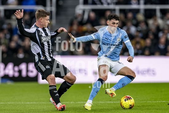 2846899 NEWCASTLE UPON TYNE, INGLATERRA - 22 DE NOVEMBRO: Phil Foden, do Manchester City (D), controla a bola sob pressao de Harvey Barnes, do Newcastle United (E), durante a partida da Premier League entre Newcastle United e Manchester City no St James Park, em 22 de novembro de 2025, em Newcastle, Inglaterra. (Richard Callis/Fotoarena)