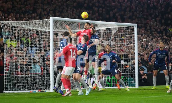 2869361 Morgan Gibbs-White, do Nottingham Forest, ganha a disputa de cabeca durante a partida de futebol da Premier League entre Nottingham Forest e Arsenal, no City Ground, em Nottingham. (Paul Bonser/Sports Press Photo / SPP)