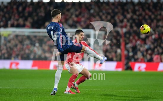 2869367 William Saliba, do Arsenal, e Igor Jesus, do Nottingham Forest, em acao durante a partida de futebol da Premier League entre Nottingham Forest e Arsenal, no City Ground, em Nottingham. (Paul Bonser/Sports Press Photo / SPP)