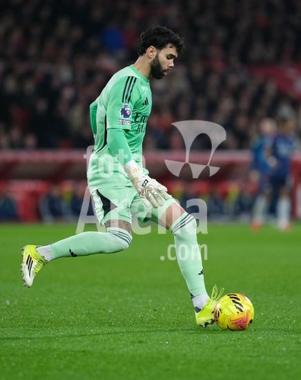 2869363 David Raya, do Arsenal, com a bola durante a partida de futebol da Premier League entre Nottingham Forest e Arsenal, no City Ground, em Nottingham. (Paul Bonser/Sports Press Photo / SPP)