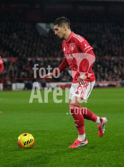 2869372 Nicolas Dominguez, do Nottingham Forest, corre com a bola durante a partida de futebol da Premier League entre Nottingham Forest e Arsenal, no City Ground, em Nottingham. (Paul Bonser/Sports Press Photo / SPP)