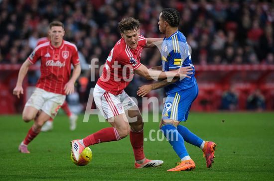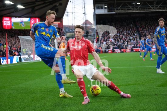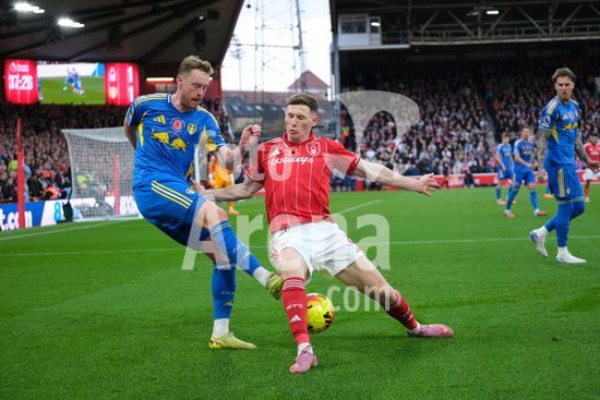 2839268 Joe Rodon, do Leeds United, disputa a bola com Elliot Anderson, do Nottingham Forest, durante a partida da Premier League entre Nottingham Forest e Leeds United, no City Ground, em Nottingham. (Paul Bonser/Sports Press Photo / SPP)