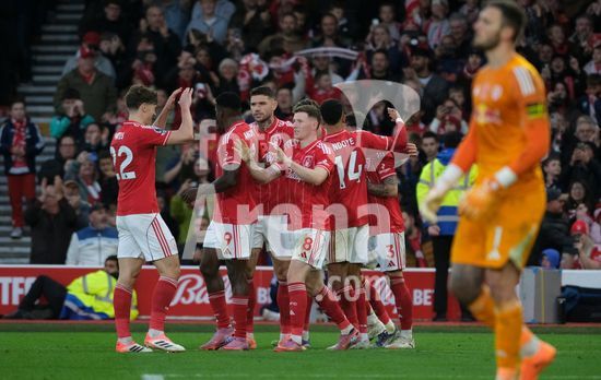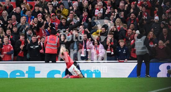 2839282 Elliot Anderson, do Nottingham Forest, comemora o gol de penalti marcado aos 90+1 minutos, que garantiu o placar de 3 a 1 para o Nottingham Forest e o Leeds United, durante a partida da Premier League disputada no City Ground, em Nottingham. (Paul Bonser/Sports Press Photo / SPP)