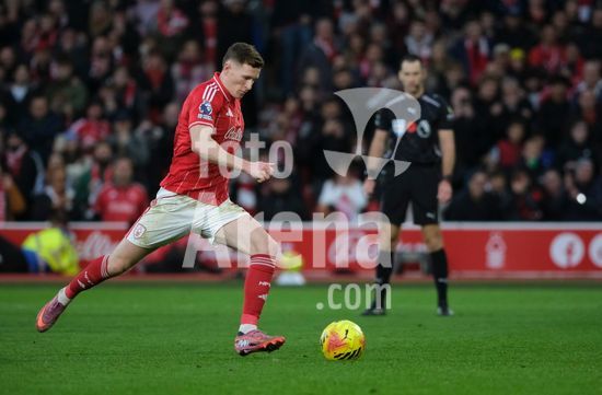 2839277 Elliot Anderson, do Nottingham Forest, cobra o penalti e marca o gol da vitoria por 3 a 1 aos 90+1 minutos do segundo tempo, durante a partida da Premier League entre Nottingham Forest e Leeds United, no City Ground, em Nottingham. (Paul Bonser/Sports Press Photo / SPP)