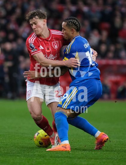 2839302 Nicolo Savona, do Nottingham Forest, disputa a bola com Noah Okafor, do Leeds United, durante a partida da Premier League entre Nottingham Forest e Leeds United, no City Ground, em Nottingham. Placar final: 3 a 1. (Paul Bonser/Sports Press Photo / SPP)