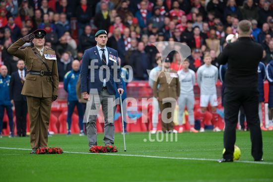 2839484 Ex-militares depositaram coroas de flores no gramado em homenagem ao Dia da Lembranca durante a partida de futebol da Premier League entre Nottingham Forest e Leeds United no City Ground, em Nottingham. Placar final: 3 a 1. (Paul Bonser/Sports Press Photo / SPP)