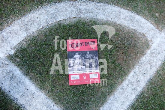 2893026 Programa do jogo exibido no gramado antes do pontape inicial durante a partida de futebol da Premier League entre Nottingham Forest e Liverpool FC no City Ground em Nottingham. (Paul Bonser/Sports Press Photo / SPP)