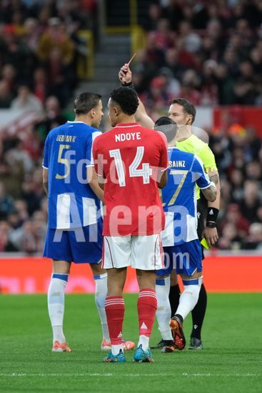 2926232 NOTTINGHAM, INGLATERRA - 16 DE ABRIL: Jan Bednarek, do FC Porto, recebe um cartao vermelho por uma falta em Chris Wood, do Nottingham Forest, durante a partida das quartas de final da Liga Europa da UEFA entre Nottingham Forest e FC Porto, no City Ground, em 16 de abril de 2026, em Nottingham, Inglaterra. (Paul Bonser / Sports Press Photo / SPP)