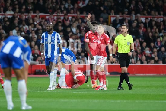 2926372 NOTTINGHAM, INGLATERRA - 16 DE ABRIL: Wood se machuca apos entrada que resultou no cartao vermelho para Jan Bednarek, do Porto, durante partida da Liga Europa da UEFA entre Nottingham Forest e Porto no City Ground, em 16 de abril de 2026, em Nottingham, Inglaterra. (Foto de Pedro Loureiro/Sports Press Photo) (Pedro Loureiro/Sports Press Photo / SPP)