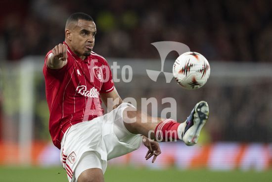 2926390 NOTTINGHAM, INGLATERRA - 16 DE ABRIL: Neco Williams, do Nottingham Forest, controla a bola durante uma partida da Liga Europa da UEFA entre Nottingham Forest e Porto, no City Ground, em 16 de abril de 2026, em Nottingham, Inglaterra. (Pedro Loureiro/SPP)