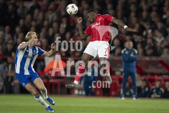 2926356 NOTTINGHAM, INGLATERRA - 16 DE ABRIL: Terem Moffi, do Porto, e Jair Cunha, do Nottingham Forest, disputam a posse de bola durante uma partida da Liga Europa da UEFA entre Nottingham Forest e Porto, no City Ground, em 16 de abril de 2026, em Nottingham, Inglaterra. (Foto de Pedro Loureiro/Sports Press Photo) (Pedro Loureiro/Sports Press Photo / SPP)