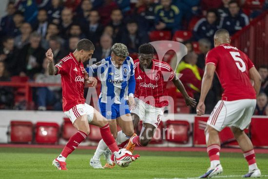 2926398 NOTTINGHAM, INGLATERRA - 16 DE ABRIL: Gabri Veiga, do Porto, disputa a posse de bola com Ibrahim Sangare e Nicolas Dominguez, ambos do Nottingham Forest, durante uma partida da Liga Europa da UEFA entre Nottingham Forest e Porto, no City Ground, em 16 de abril de 2026, em Nottingham, Inglaterra. (Pedro Loureiro/SPP)