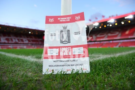 2882234 Programa do jogo exibido no gramado antes do pontape inicial durante a partida de futebol da Premier League entre Nottingham Forest e Wolverhampton Wanderers no City Ground em Nottingham. (Paul Bonser/Sports Press Photo / SPP)