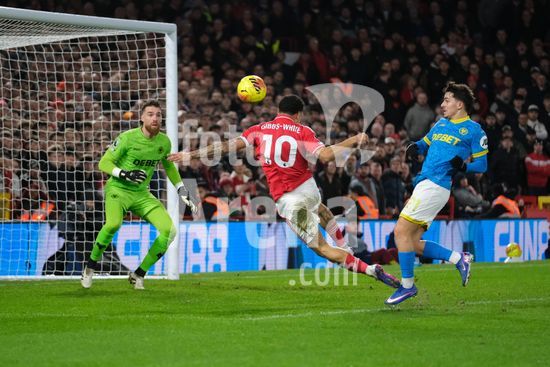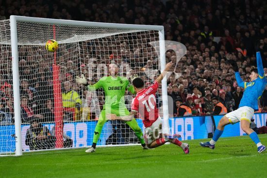 2882261 Morgan Gibbs-White, do Nottingham Forest, cabeceia em direcao ao gol durante a partida da Premier League entre Nottingham Forest e Wolverhampton Wanderers, no City Ground, em Nottingham. (Paul Bonser/Sports Press Photo / SPP)