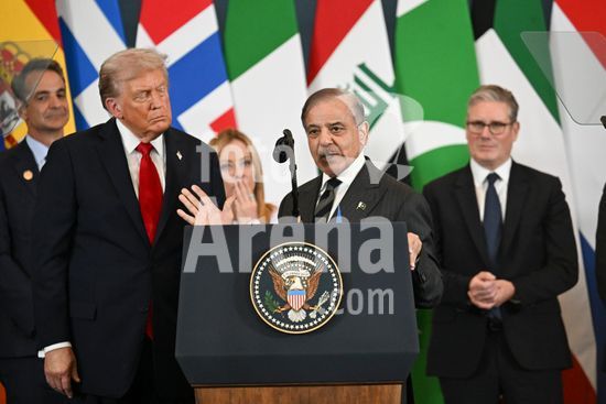 ny131025141812 Prime Minister Shebaz Sharif of Pakistan delivers remarks during a peace summit in Sharm El-Sheikh, Egypt, on Monday, Oct. 13, 2025. President Donald Trump listens at left. The meeting in Egypt could expedite an end to the Gaza war, but regional powers must still resolve the thorny details that have stymied negotiations. (Kenny Holston/The New York Times/Fotoarena)