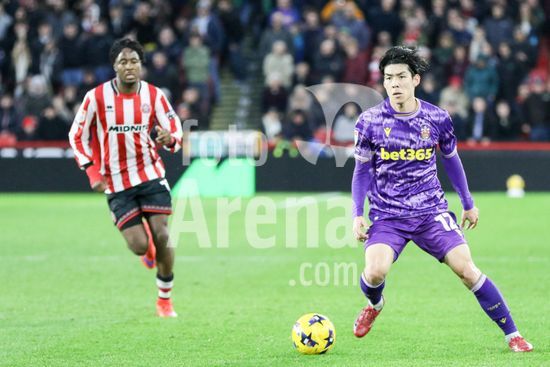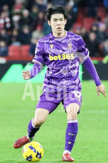 2854569 Tatsuki Seko (12 Stoke City) controla a bola durante a partida do EFL Sky Bet Championship entre Sheffield United e Stoke City em Bramall Lane, Sheffield, Inglaterra, em 6 de dezembro de 2025. (Sean Chandler / SPP)