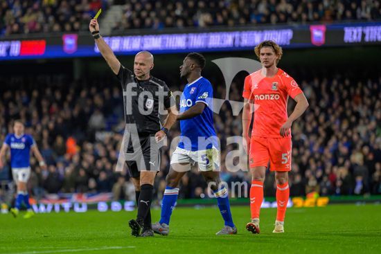2854591 O arbitro Paul Tierney mostra um cartao amarelo para Christian Walton (28, Ipswich Town) durante o jogo do Sky Bet Championship entre Ipswich Town e Coventry City FC no Portman Road em Ipswich, Inglaterra. (Foto de Keeran Marquis/Sports Press Photo/SPP) (Keeran Marquis/SPP)