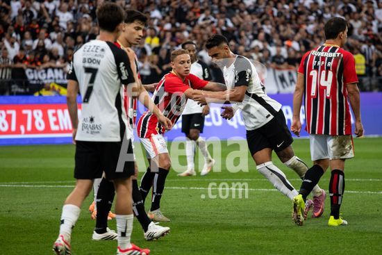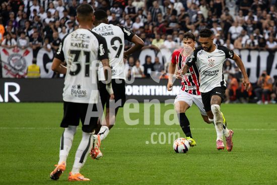 2870105 Matheuzinho (Corinthians) e Wendell (São Paulo) durante a partida entre Corinthians e São Paulo, válida pela 3ª rodada do Paulistão, realizada na tarde deste domingo (18) na Neo Química Arena em São Paulo, SP.