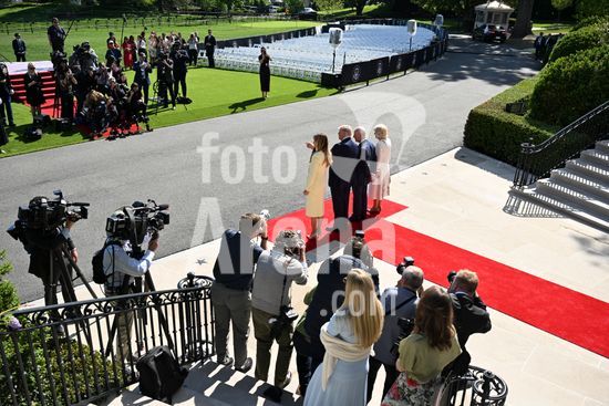 ny270426173411 President Donald Trump and first lady Melania Trump, right, greet King Charles III as he arrives with Queen Camilla of the United Kingdom at the White House in Washington, on Monday, April 27, 2026. The British royals arrived for a four-day visit hosted by President Donald Trump, including an address to Congress and a banquet at the White House. (Kenny Holston/The New York Times/Fotoarena)